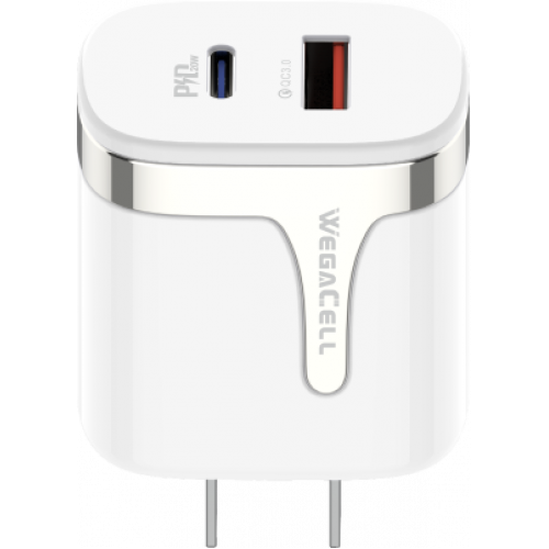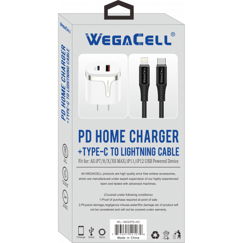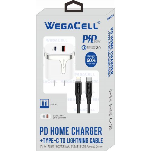 Apple Compatible Combo of Universal Dual Port Fast Charging USB C-USB Home Wall PD Charger and Lightning-USB Type C Cable - WegaCell: WL-1605IPD-HC