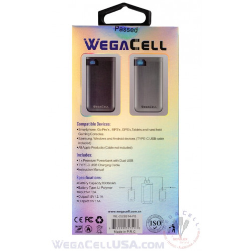 8000 mAh Power Bank fast Charging Lithium-Polymer Portable Battery Pack - WegaCell: WL-2USB14-PB