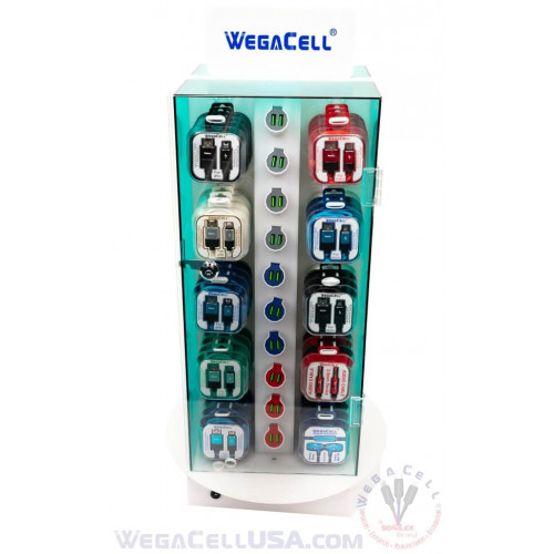 Rotating LED Double-Sided Lockable Counter Display Rack 100 pcs. Model No. WegaCell: WL-9907ASL. Display Products: iPhone Data Cable Micro Data Cable Type C Data Cable Aux Audio Cable Earphones Car Charger Home Charger