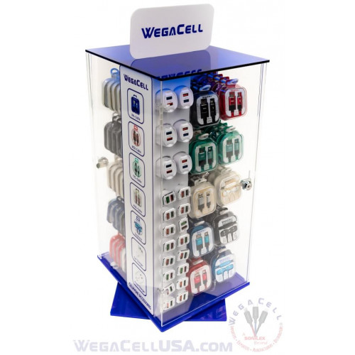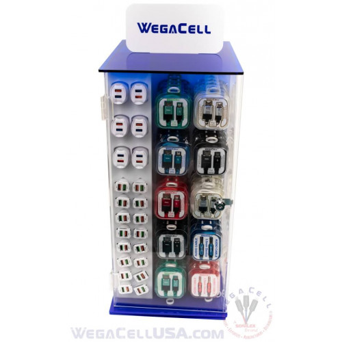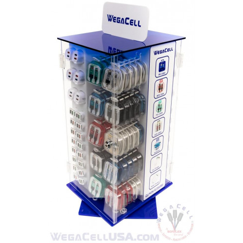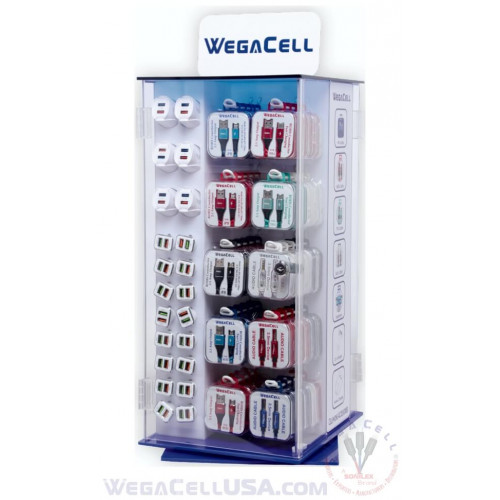 Rotating Double-Sided Lockable Counter Display Rack 144 pcs. Model No. WegaCell: WL-9914ASD. Display Products: iPhone Data Cable Micro Data Cable Type C Data Cable Aux Audio Cable Earphones Car Charger Home Charger
