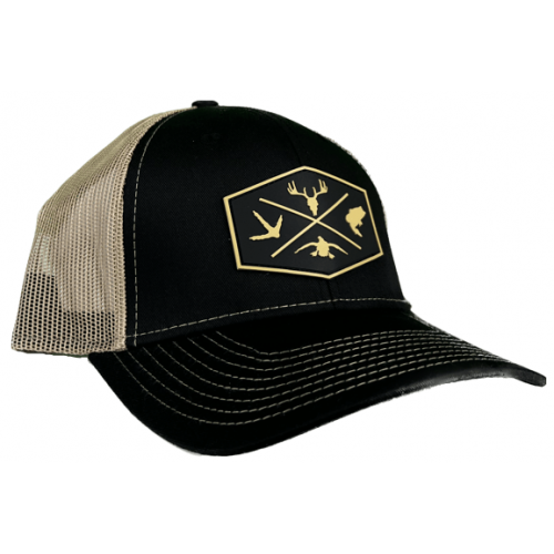 Rubber patch outdoor series black/tan logo. One size fits all, stretch fit closure.