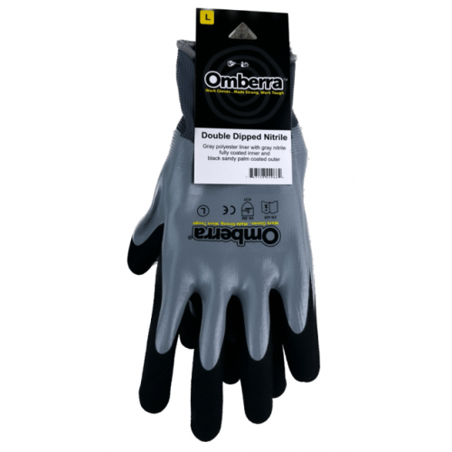 Gray polyester liner with gray nitrile fully coated inner and black sandy palm coasted outer. 12 PRS gloves per bundle.