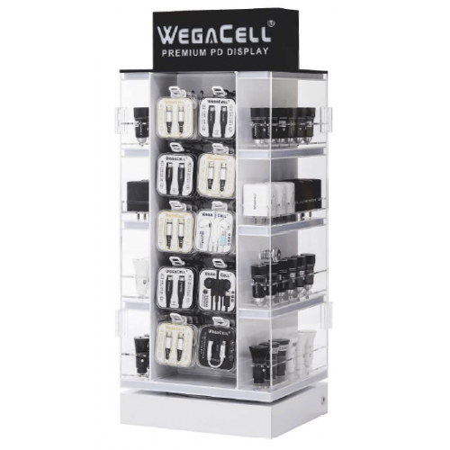Lockable Counter Display Rack 128 pcs. Model No. Wegacell: WL-9935ASD. Display Products: PD Car Charger, PD Home Charger, Type C - Lightning Cable, Type C - Type C Cable, iPhone Earphone, Type C Earphone, iPhone Connector, Type C Connector